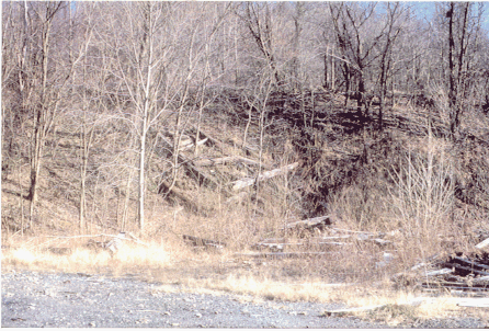 Site of Union Furnace c1980. Ore roasting beds on the upper level area. It was a common practice to pre-roast the crushed ore by burning between layers of charcoal.